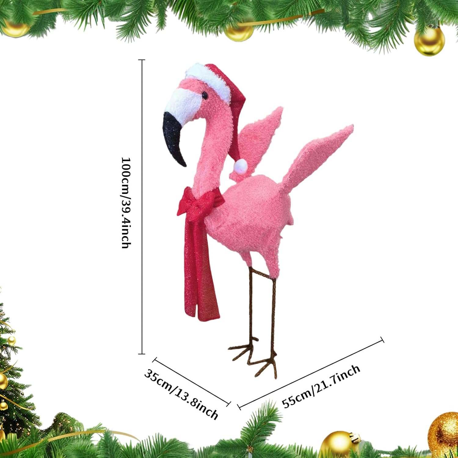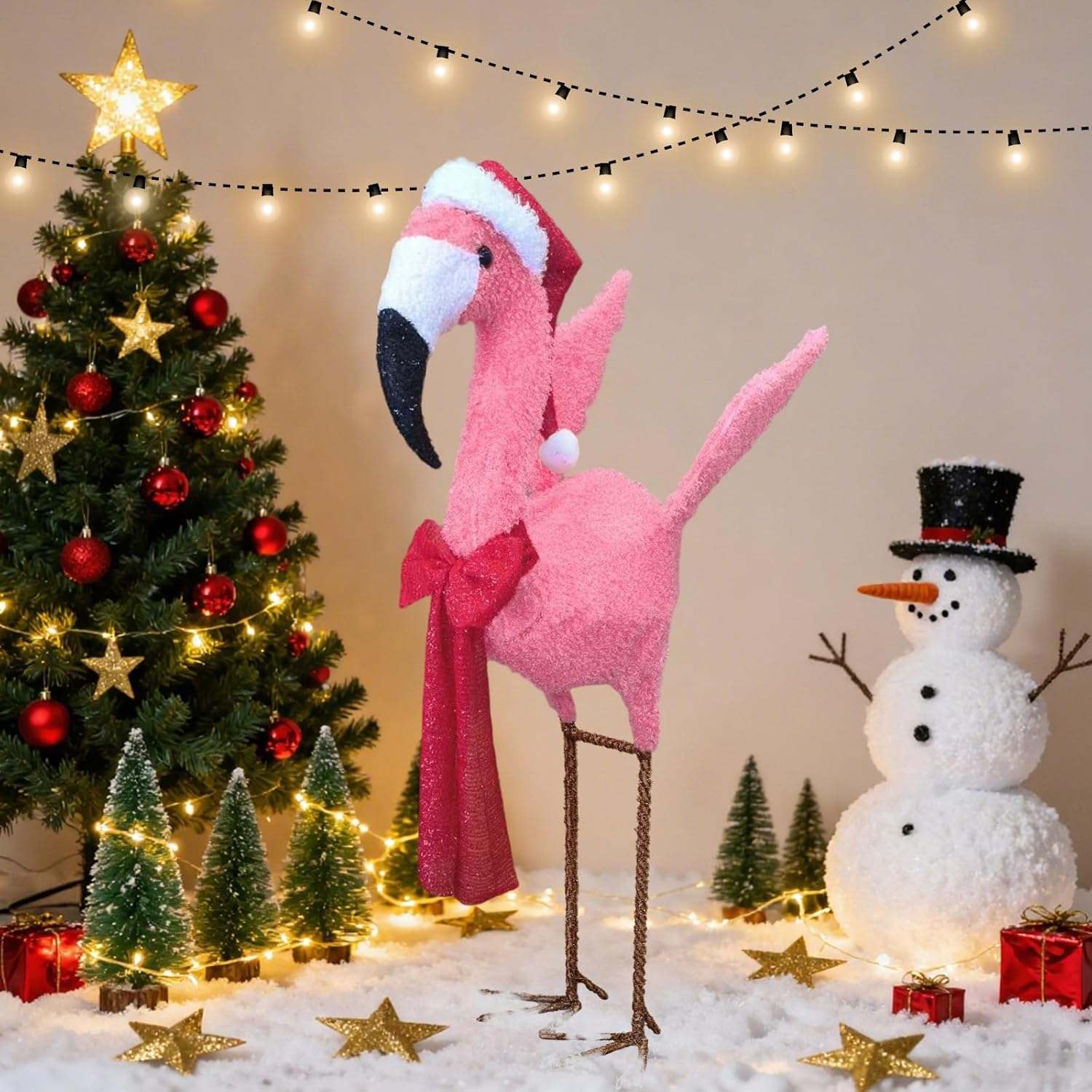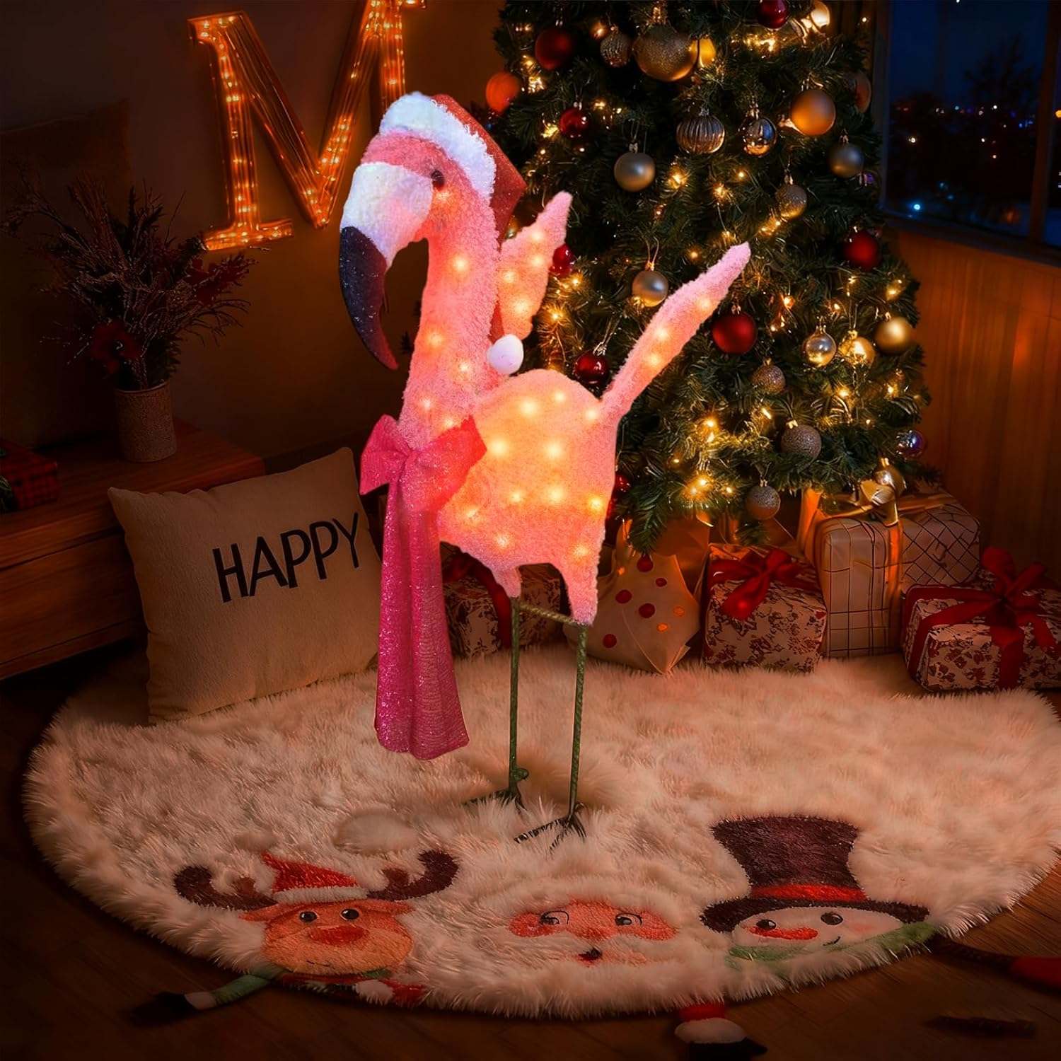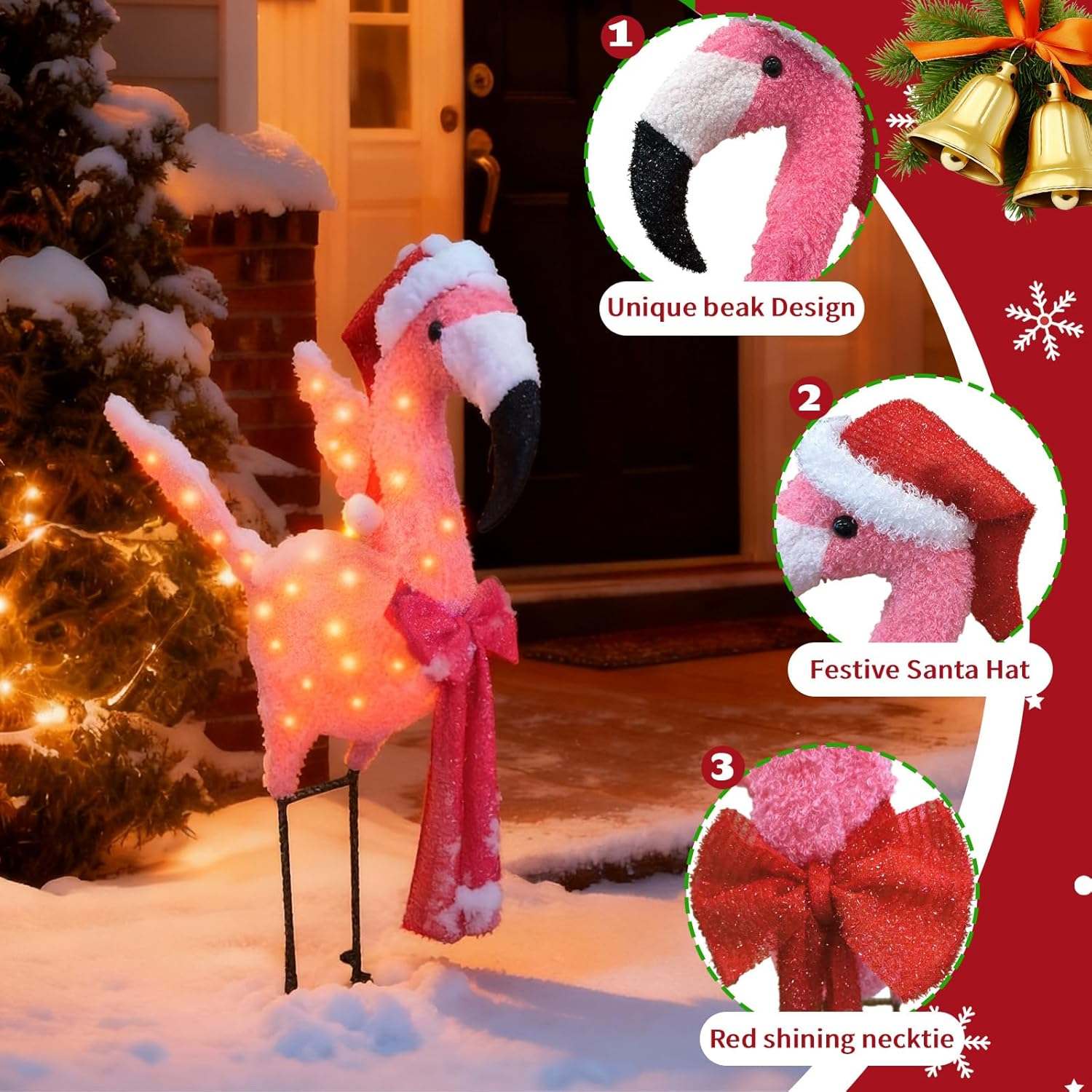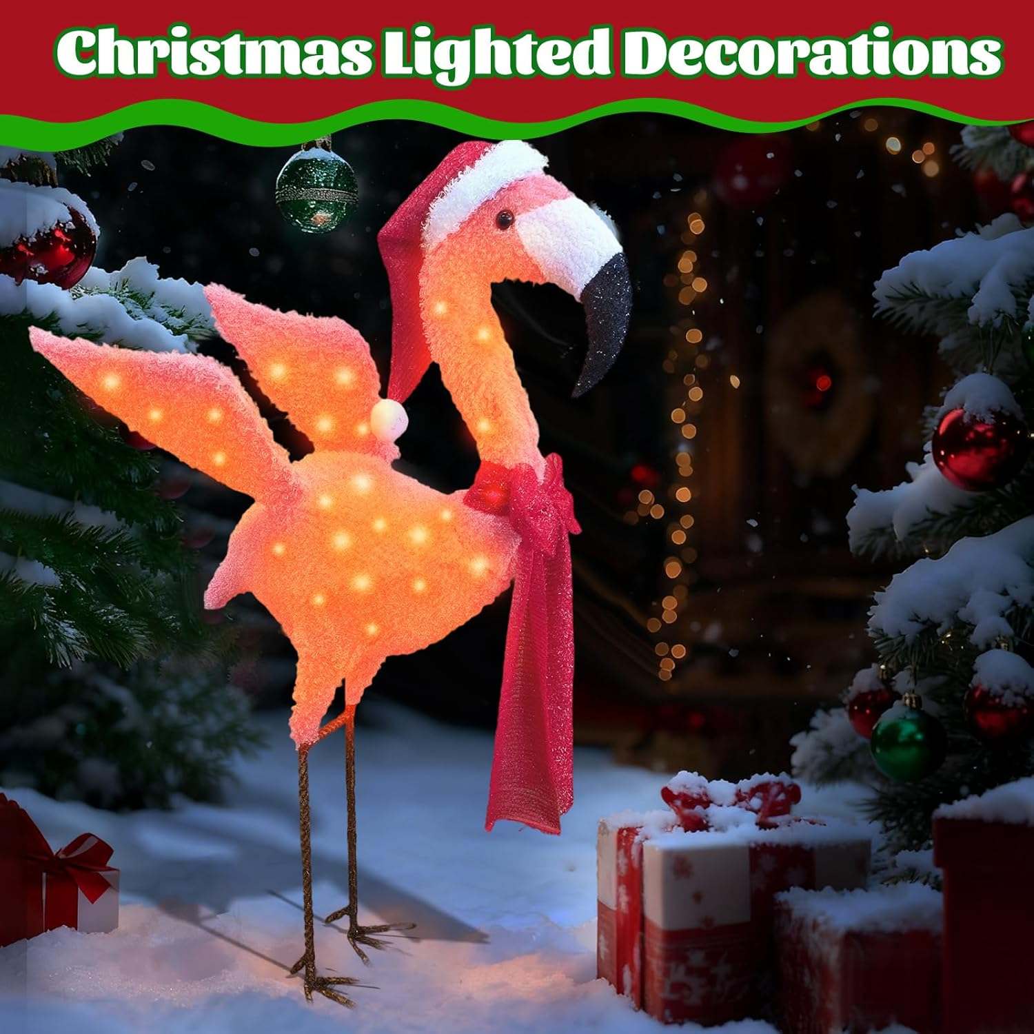 Celebrate the legend of Rudolph with this stunning 3D Lighted Christmas Flamingo Outdoor Decoration with Santa Hat & Scarf, Pink Yard Décor, Warm White Glow for Holiday Lawn, Porch & Garden Displays, festive glow to any indoor or outdoor space. Crafted with a durable metal frame and shimmering fabric, it’s easy to install and built to last through many joyful Christmases. Perfect for front doors, windows, garages, and holiday gatherings — let Rudolph welcome everyone with holiday cheer!