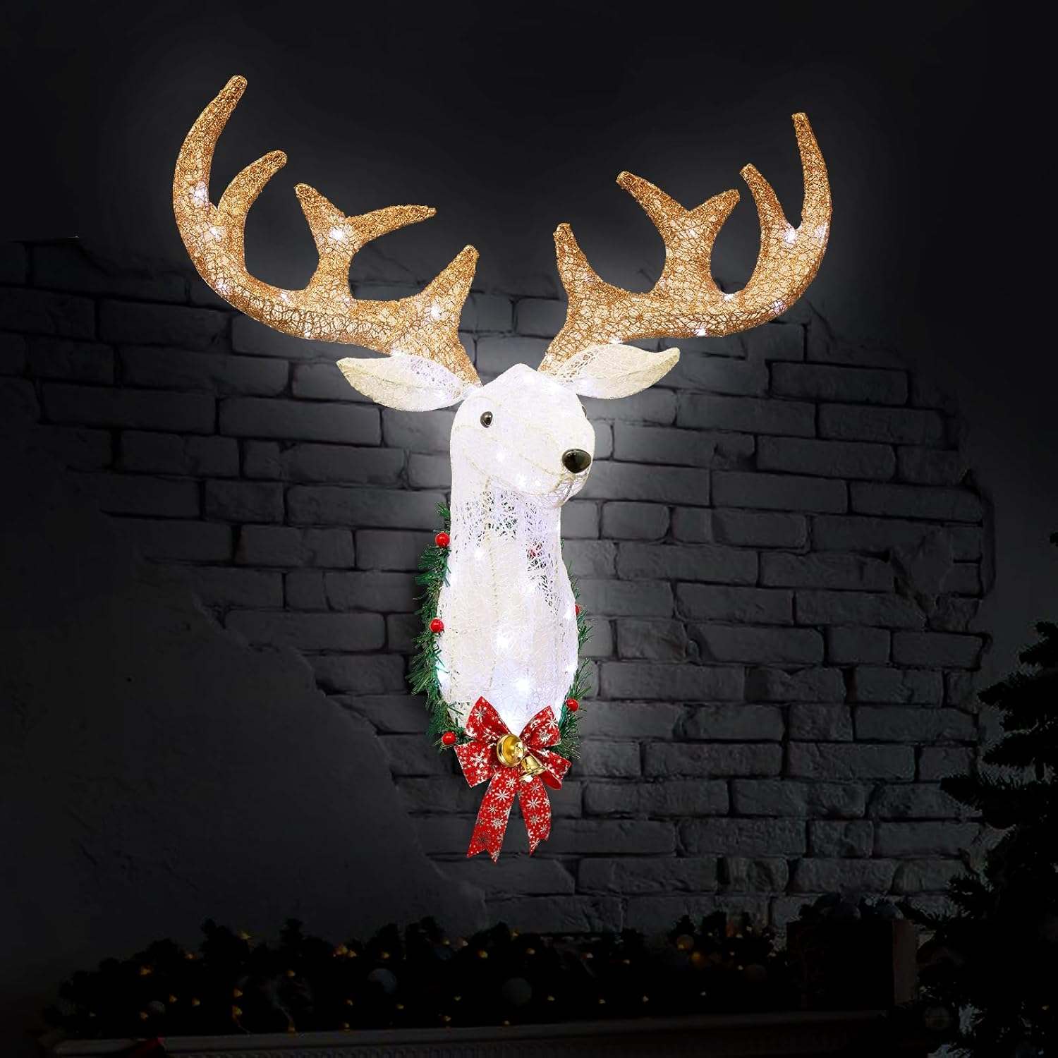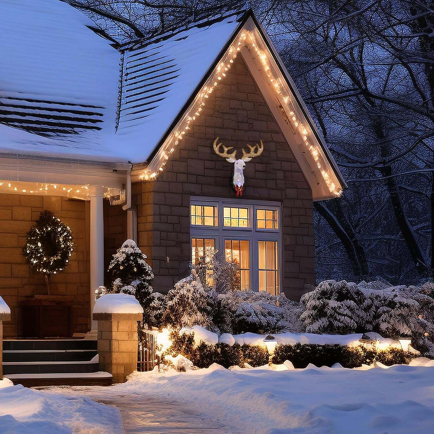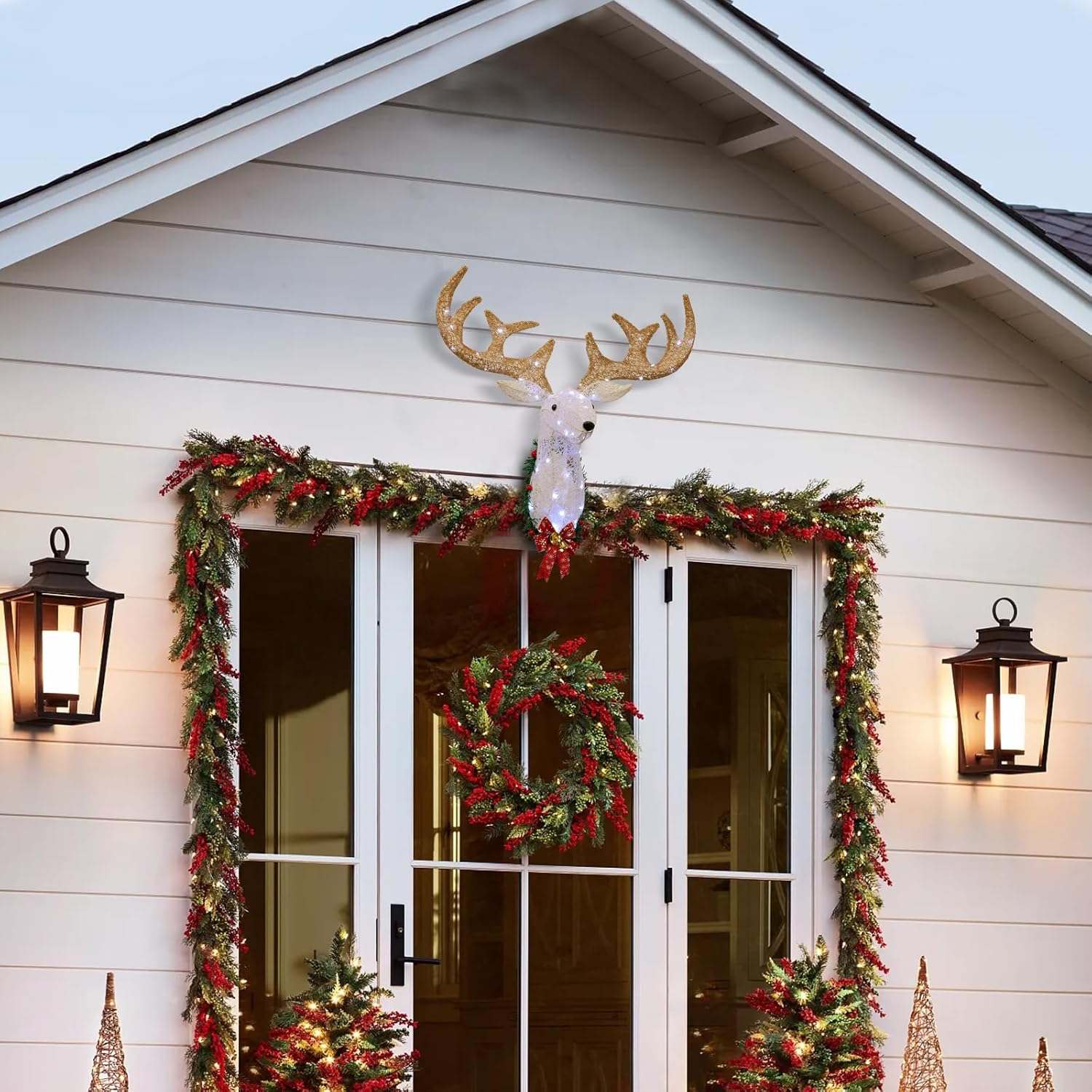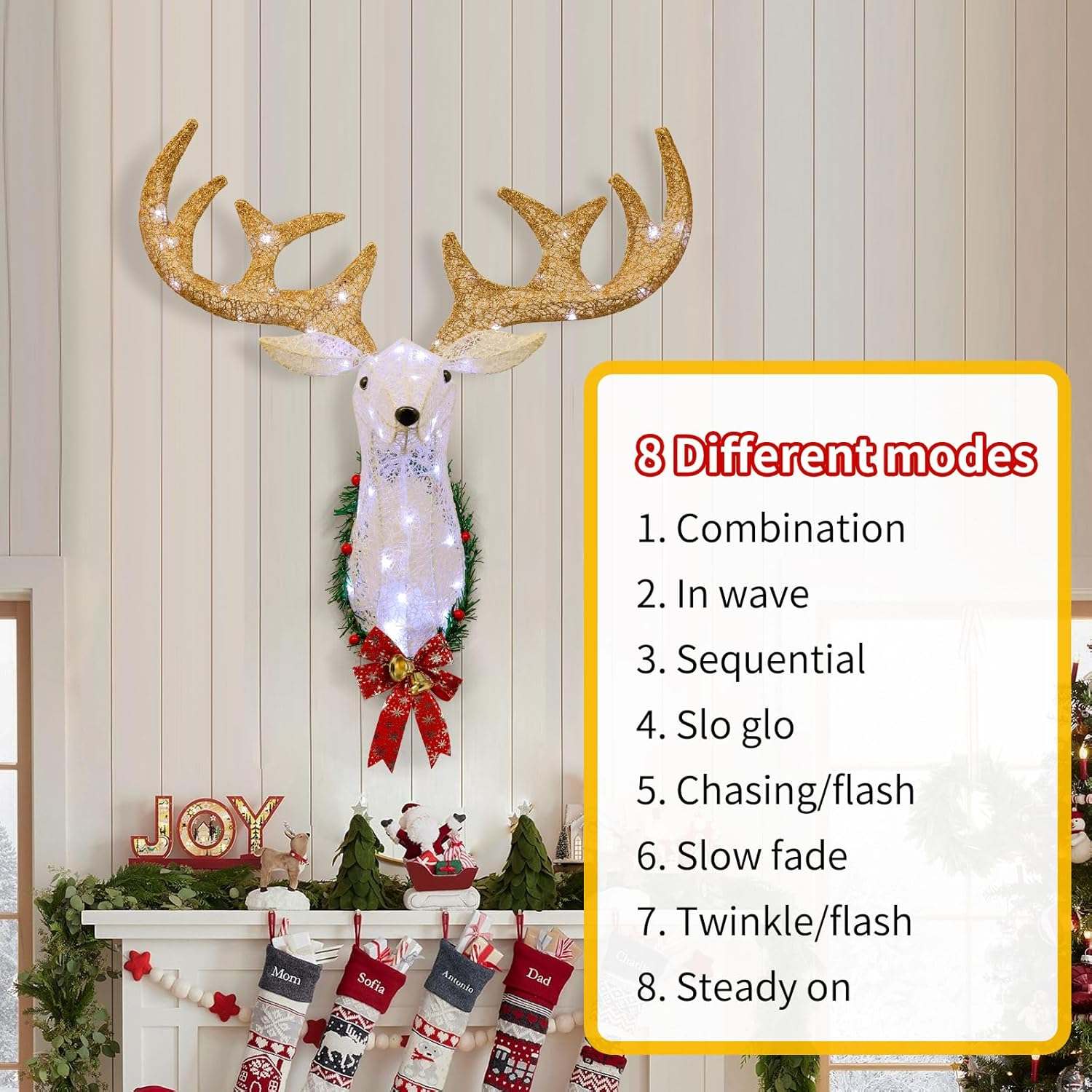 • Premium Quality Materials – Crafted with a sturdy metal frame and covered with metallic fabric, this reindeer head wreath is durable and weather-resistant for both indoor and outdoor use. The sparkling golden finish and glowing LED lights make it a stunning focal point of your Christmas décor.