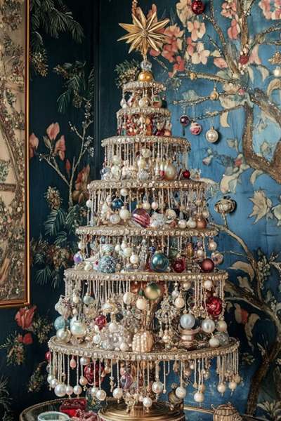 Our Celebration Tree has an overall product width of 40″ / 1m at the base (including the garland). The five platforms range in width from 34″ / 86.5cm (bottom) to 10″ / 25.5cm (top) (excluding the garland which extends out 3.9″ / 10cm on each side of the platform).